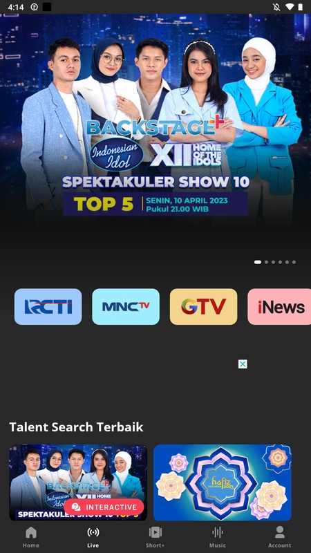 The channels available on RCTI+ include RC TV, MNCTV, iNEWS, and GTV. All content can be viewed live, on-demand, or offline after it's downloaded. The maximum video quality offered by the free version is 720p; if you want better quality and more content, you'll have to pay for the premium subscription.