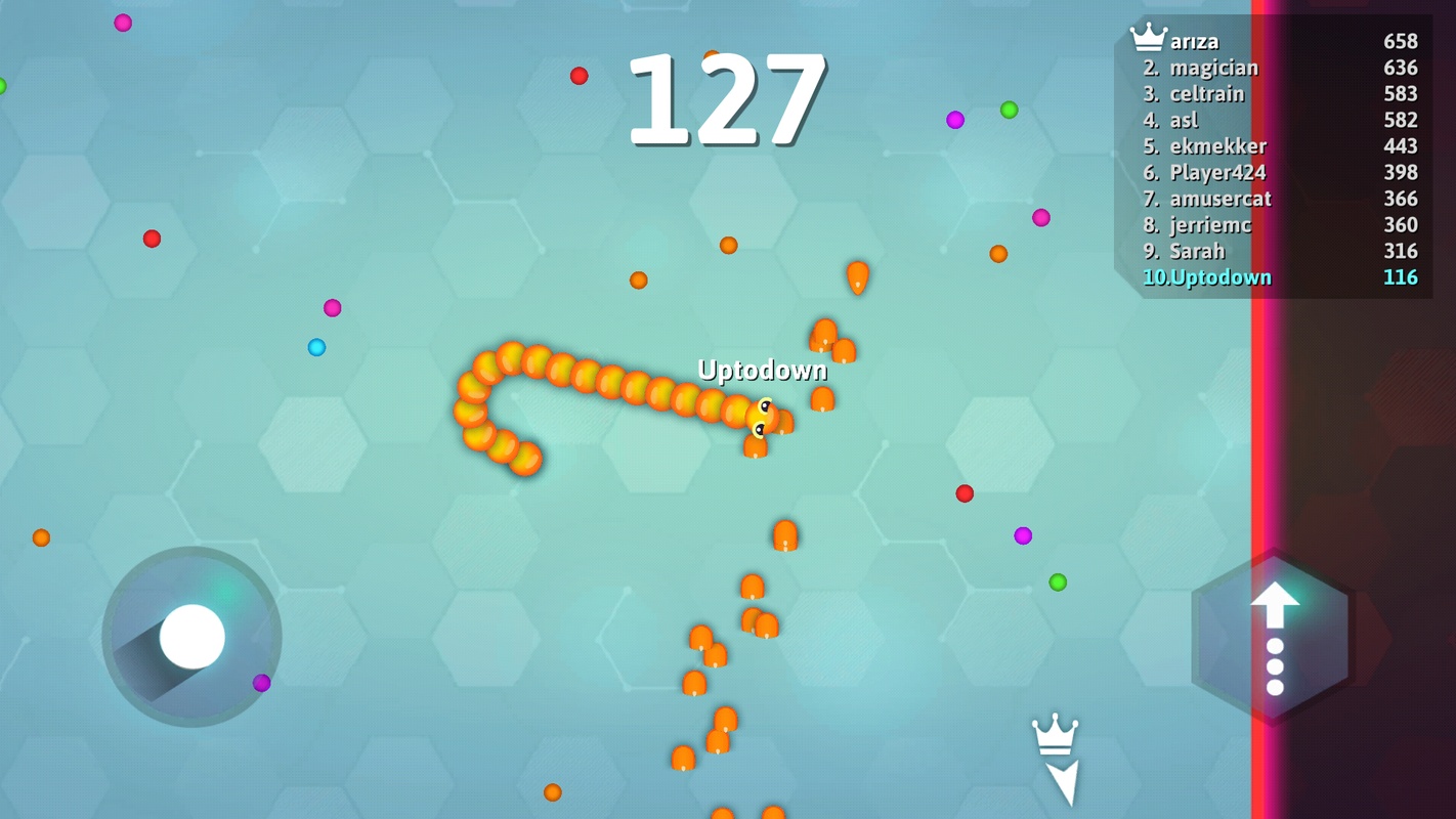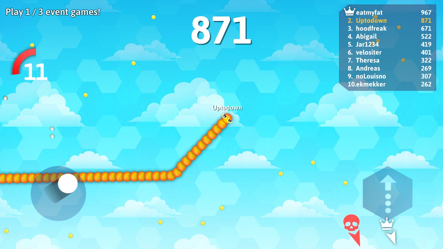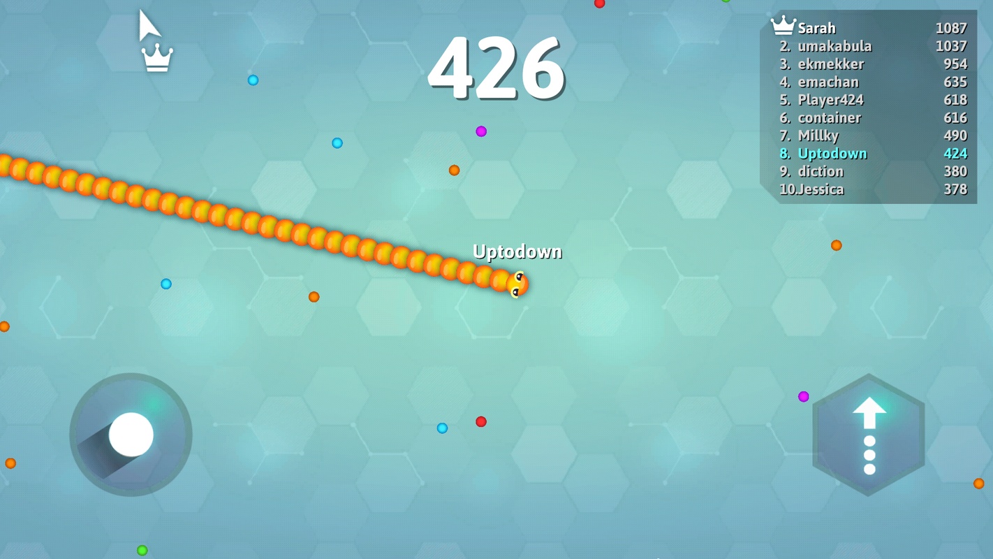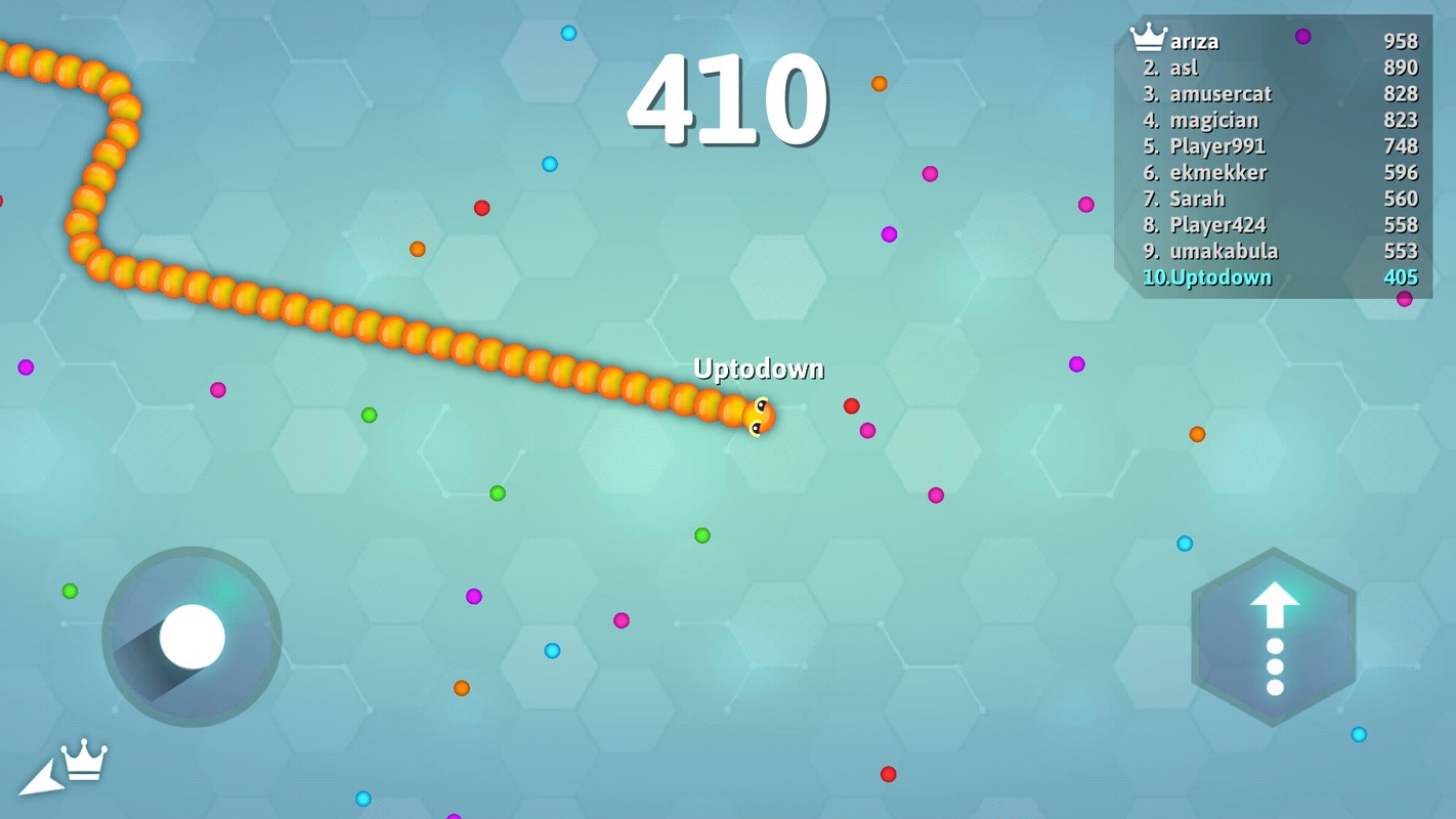 There are two ways to eat the balls. The first is eating the loose balls in the setting, which will give you one point for each ball. But, when a snake collides with another, or against the wall, all their points are turned into balls worth 10 points each. So, you've got to get the other snakes to collide head-on with your tail to get all their points.