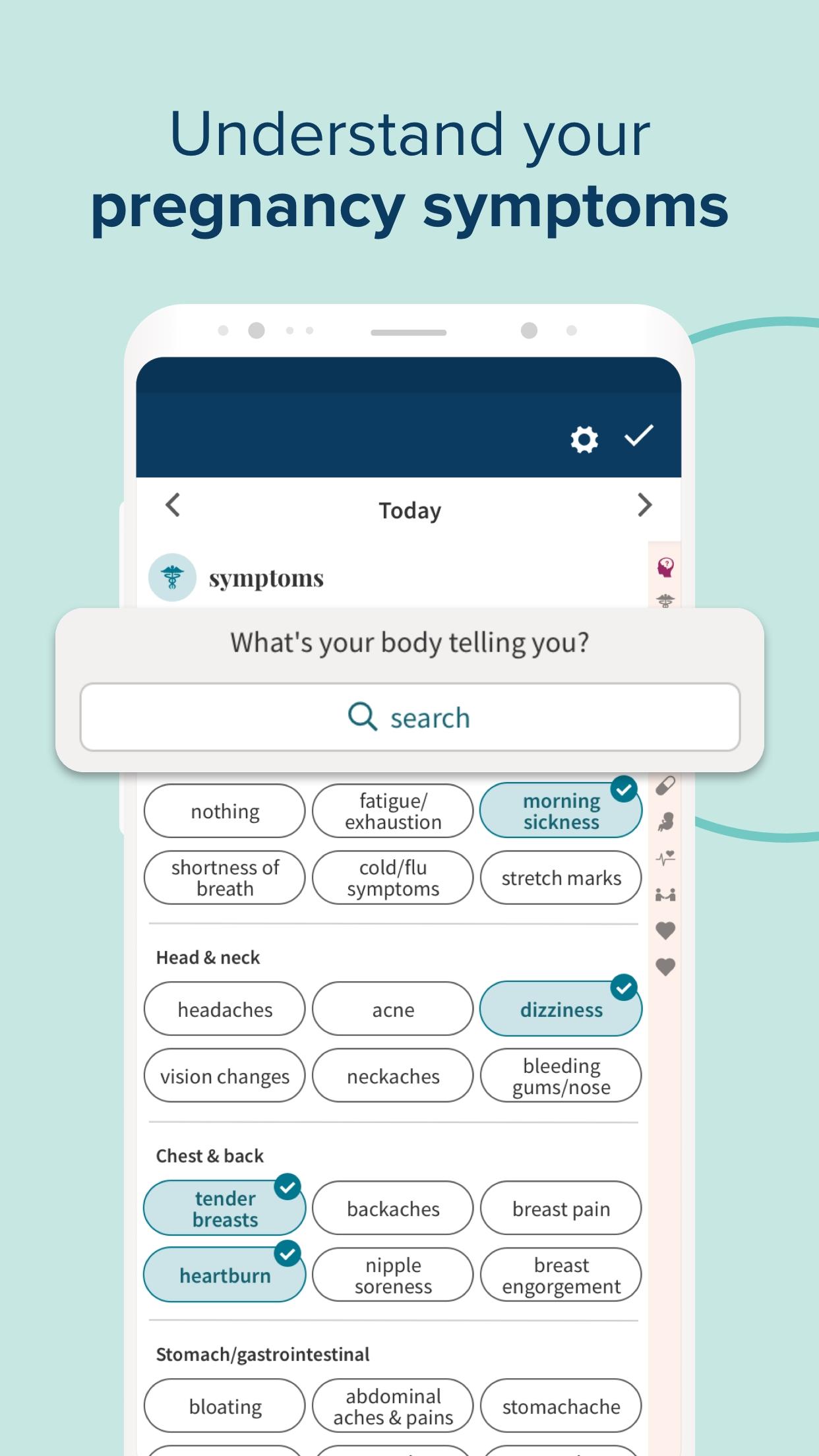 Symptom -Tracker: Die Schwangerschaft von OVIA ermöglicht es Benutzern, ihre Schwangerschaftssymptome zu verfolgen und personalisierte Ratschläge zur Behandlung zu erhalten. Es identifiziert auch Muster und alarmiert Benutzer auf potenzielle Bedenken.