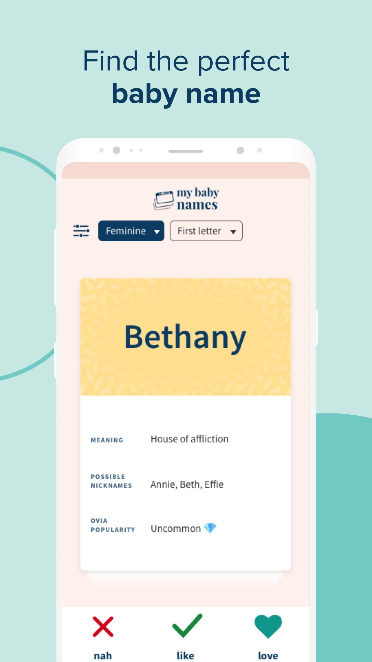 ◆ meine Babynamen Überlegen Sie Ihre Lieblingsnamen. Wischen Sie durch Tausende von Namen und "Like" und "Love" Ihre Favoriten. Ihr Baby und lernt potenzielle Symptome.