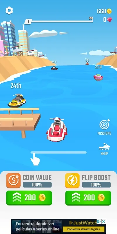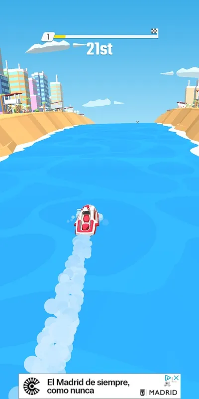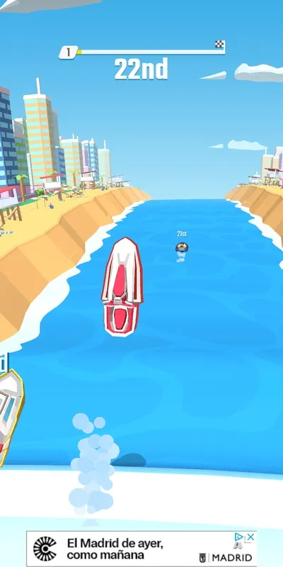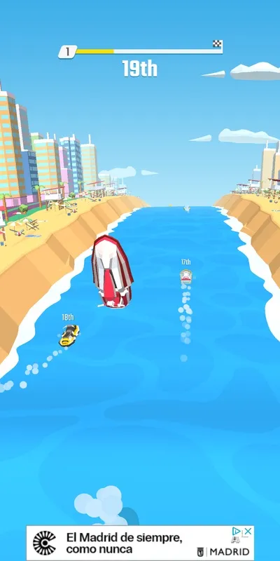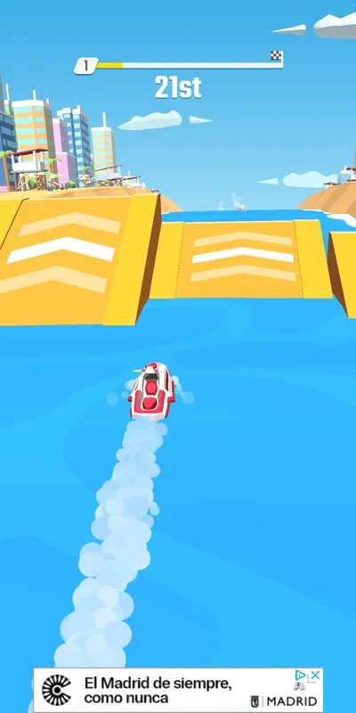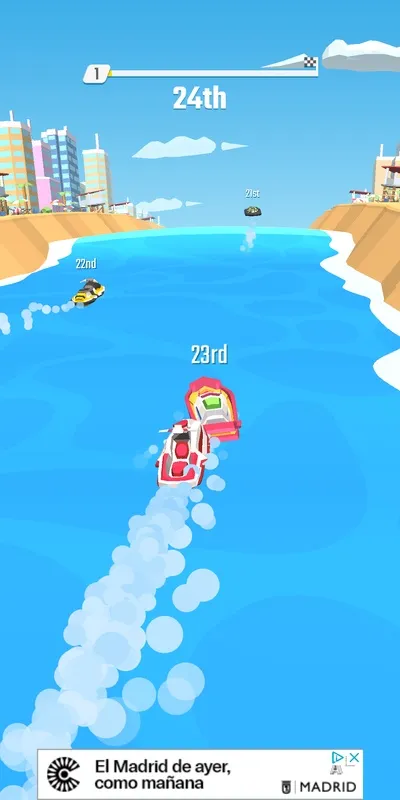 Once you're finished learning how to drive a jet ski, you can start racing. In order to get your motor started, long press on your screen. When you lift your fingertip off the screen your jet ski stalls out. So, be extra careful when you're racing or you lose your position to your opponents. In the upper part of your screen, see how far you are from the finish line and which place you're in.
