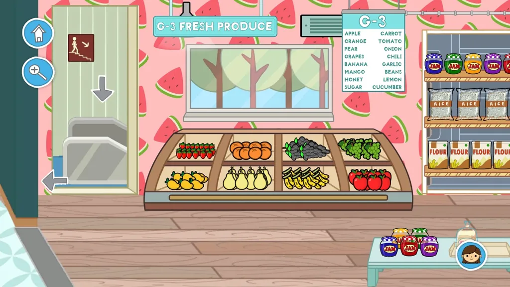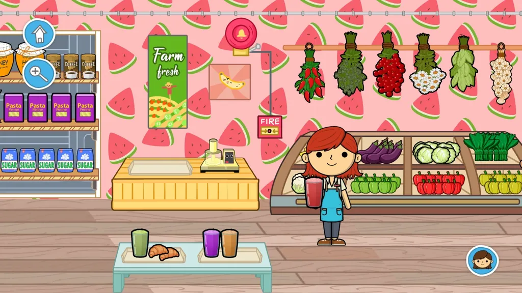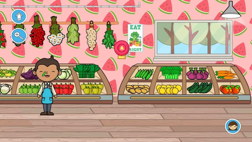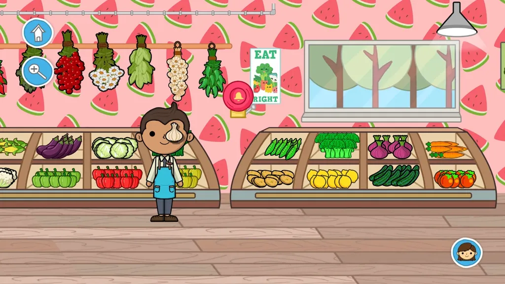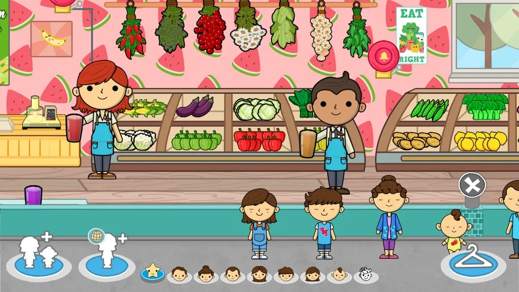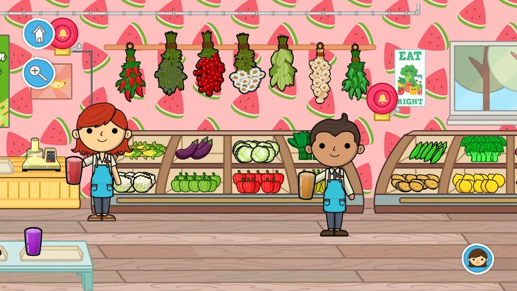 In each part of the grocery store, there are different characters that you can interact with by putting things in their hands or feeding them. You can also make new characters appear to give each setting a little variety.