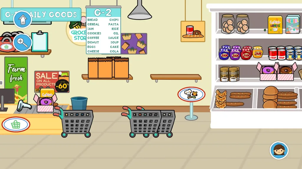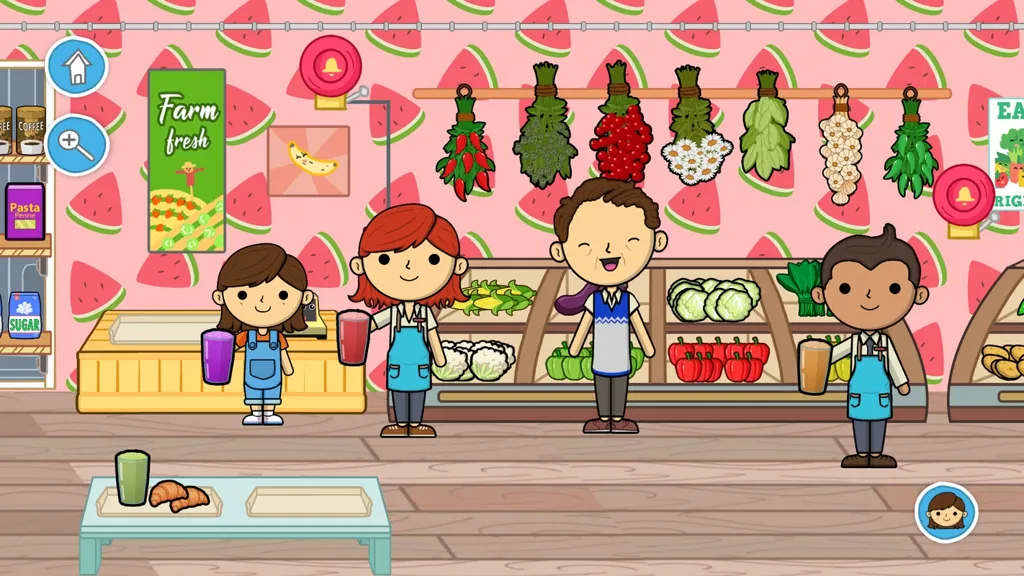 Lila's World: Grocery Store is an for kids that simulates a trip to the supermarket, where you can buy all kinds of groceries, including fruits, vegetables, pasta, juices, snacks, sweets, chicken, fish, ice cream, and much more.